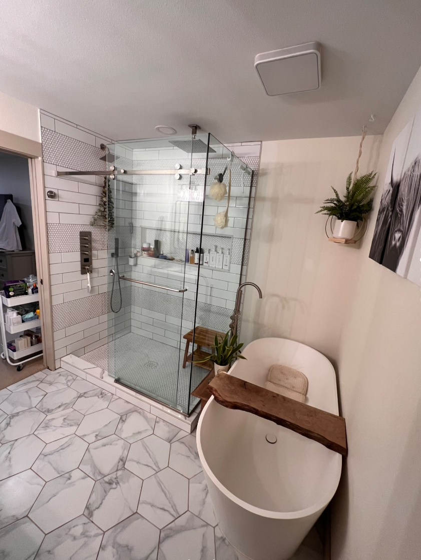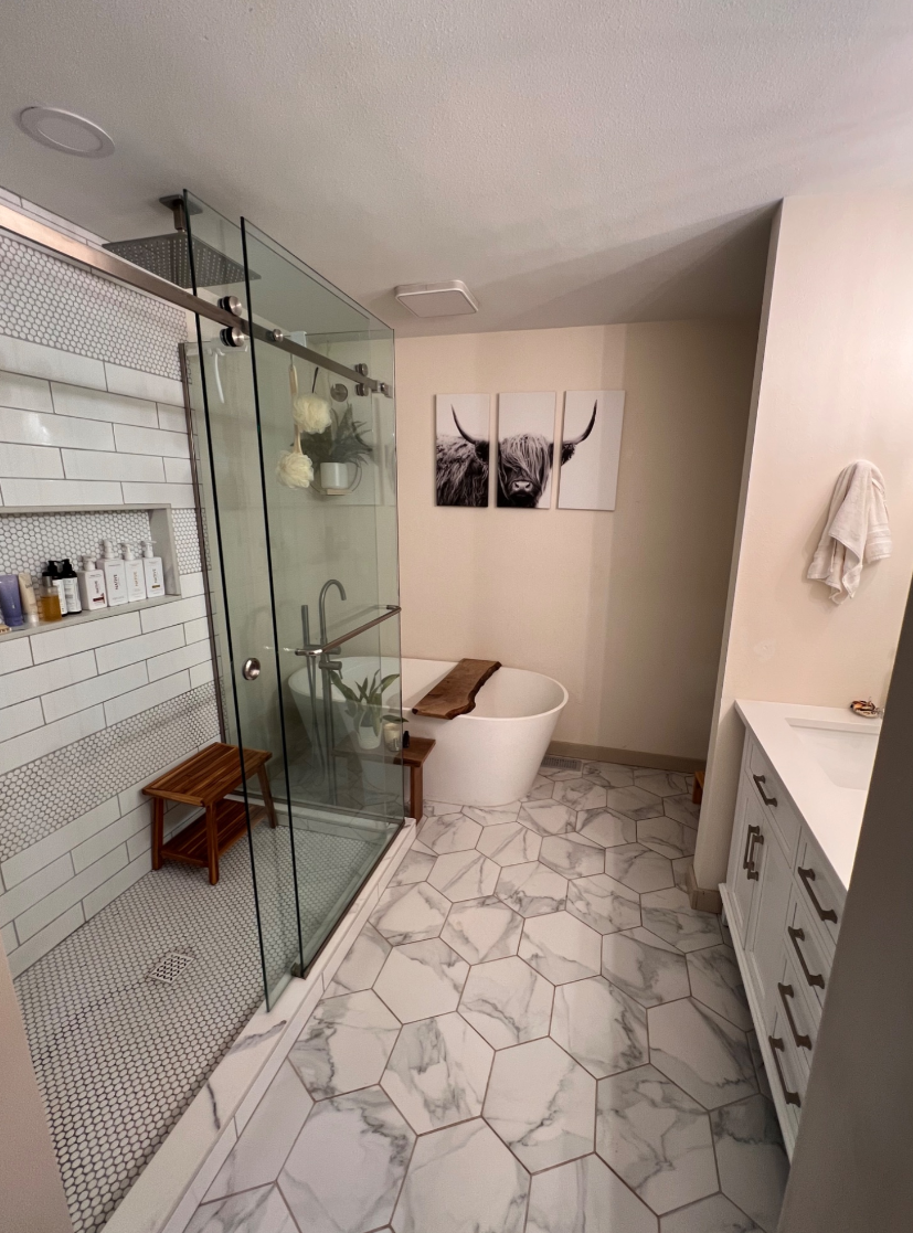 This bathroom remodel project focused on transforming a dated, enclosed layout into an open, functional, and luxurious space. The client’s primary goal was to improve flow and bring a modern feel to the room through thoughtful reconfiguration and updated finishes.